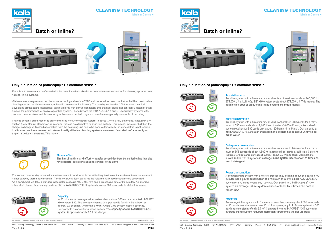 When it comes to cleaning of large volumes of PCBs, the question arises as to whether compact batch systems can handle similar capacities in similar times to large inline systems.