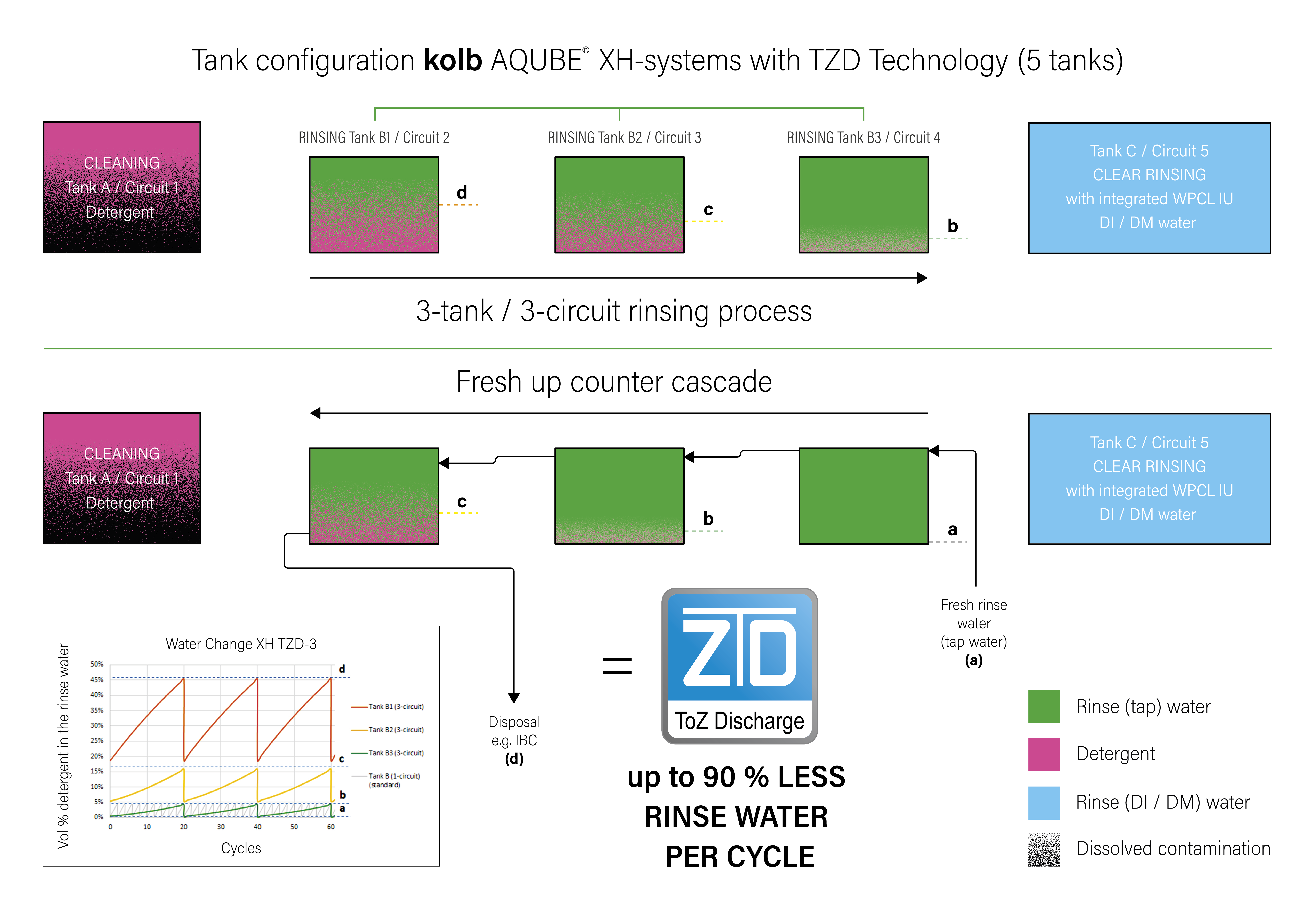 kolb TZD cleaning systems have up to 5 separate tank circuits: the cleaning circuit (TA), the two (TB1, TB2) or three TZD rinsing circuits (TB1, TB2, TB3) for municipal water, and the rinse cycle (TC) for DI water with an integrated WPCL IU unit for recycling rinse water containing heavy metals. In this configuration, a kolb AQUBE X7 TZD five-tank cleaning system, for example, saves up to 90% rinse water compared to standard systems with three tank cycles. The average rinse water consumption is reduced to up to 3 liters per cycle.