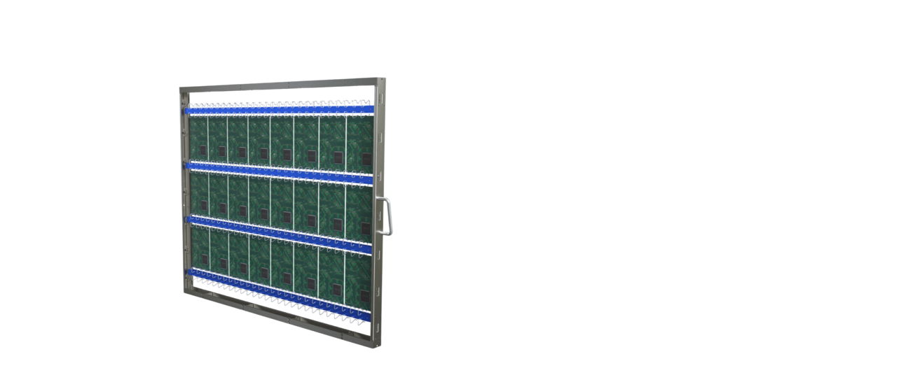 Flexibly adjustable wash frame for holding PCBs, assemblies, and other flat profiles during cleaning in vertical-systems. Easy handling thanks to simple “click-in” insertion of the cleaning goods into the spring holders.